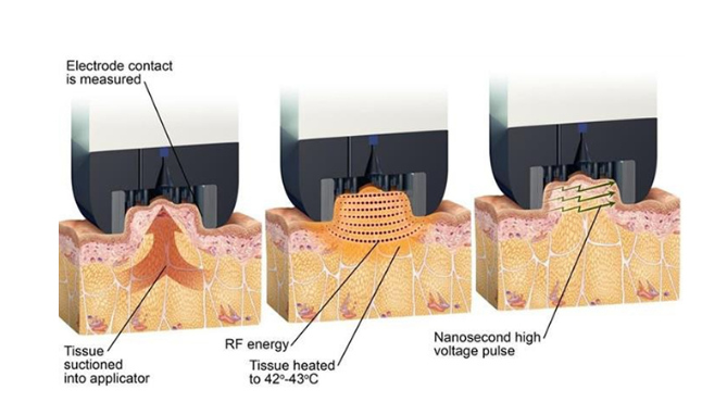 The treatment uses RF (Radiofrequency) energy to heat fat cells and trigger Electroporation, a process that temporarily opens cell membranes to stimulate fat breakdown and promote body contouring.